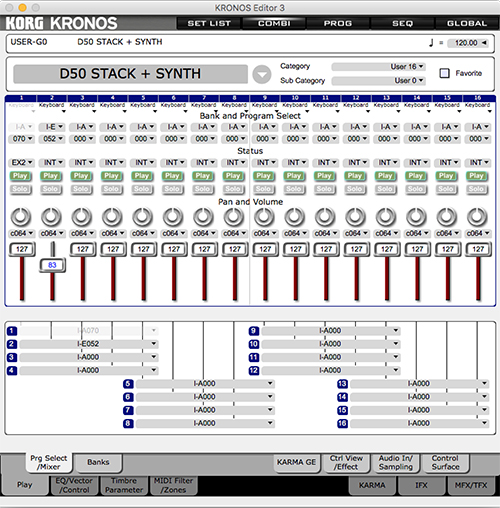 Combinations (Combis) are the heart and soul of many setups, as this is where you create splits and layers. The large display makes easy work of seeing all of the parts of your combination, though not the easiest work of actually making adjustments. We could easily toggle any of the sixteen parts (timbres, in Korg parlance) of a combi between drawing from internal or external sounds, and we applaud the fact that right on this screen, there is so much useful information. Setting up splits and layers relying on the Kronos’s vast array of internal sounds is extremely straightforward. However, the area for selecting your programs is so small that it takes a very careful touch just to hit the spot where you can select the program for a specific timbre. It’s roughly the size of a fingernail, and you may find it easier to use a stylus to touch the display rather than your finger. Things get a bit more challenging once you decide to control some outboard gear.