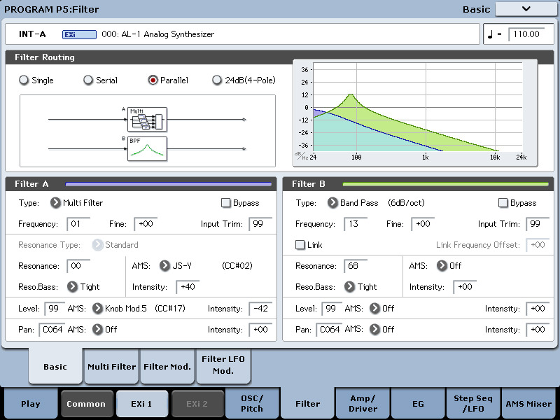 AL-1 Analog Synthesizer: This is a traditional, virtual analog synthesizer—the same one introduced in the Korg OASYS. It features dual oscillators, a sub-oscillator, noise generator, ring modulation, frequency modulation (FM), two multi-mode filters (low-pass, high-pass, band-pass, band-reject), five envelope generators, four LFOs per voice, a step sequencer, and a common LFO and common step sequencer.