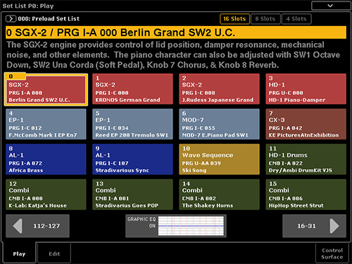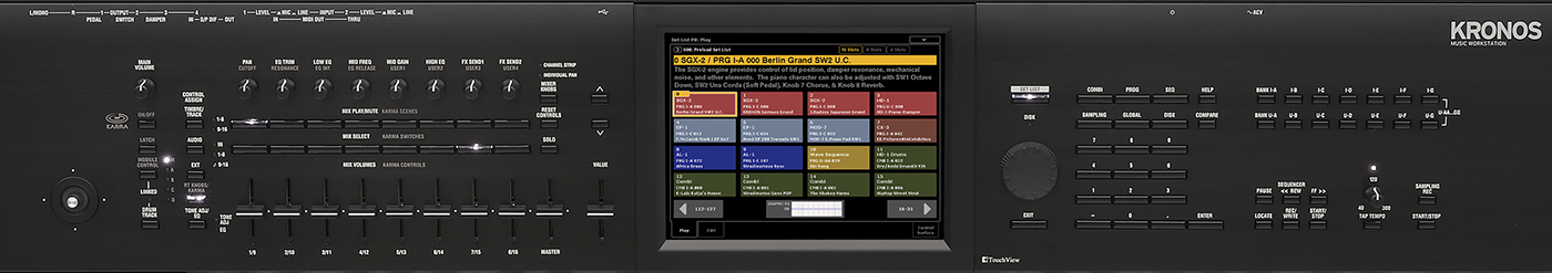 Kronos goes beyond Korg’s historical Combi/Prog/Sequencer layout by adding another interface over the top of the workstation: Set Lists. The default operating screen provides multiple “pages” of sounds/songs with easy-to-hit (because they’re large) buttons on the touch screen. A single touch calls up a combination, or a program, or a song in the sequencer—direct access to whatever you need for the next song in your set! And then, set lists go further by letting you store and display free-form notes about your song (and we’re not talking about musical notes). If you’ve ever taped an index card to your keyboard with some chord chart cheats or the lyrics to a vocal line you have a habit of forgetting, those days are behind you, as it’s easy to enter your notes directly into each song in your set list.
