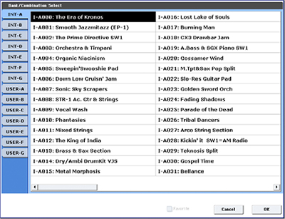Speaking of arranging sounds, Korg provides a handy Favorites tag that you can assign to your favorite programs and combis, and when you hit the Favorites filter on the display, as you sift through banks of sounds, you only see the ones you’ve tagged as favorites. We love this. But beware—after you hit the Favorites tag button to mark a sound, you have to write the combi or program in order to save the status of the Favorites tag! The first day we had our Kronos X 73, we spent hours playing through sounds, marking our favorites (without writing the change), and then we turned the Kronos off. The next day was not pleasant as we learned this particular lesson the hard way, losing all of our favorite selections. Writing sounds only takes a few seconds—you just hit the Write button twice after marking your sound as a favorite (which simply re-writes the sound in the same program/combi location, though you can just as easily save it to a new location).