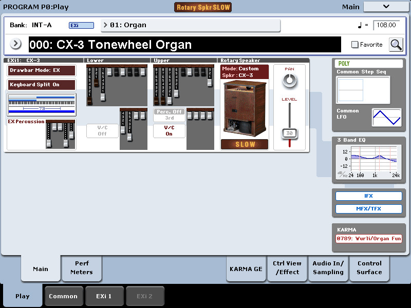 Organ sounds covered all of the classic bases, and although there was no physical “click” or detent within the Karma sliders, their heavy resistance provided a very adequate feel if you like to manipulate your organ tones mid-play. Fans of the Korg CX-3 will be right at home with the sounds, naturally, and it’s cool having a picture of the Leslie speaker cabinet on the color display. But more cool is the full control you actually have over the speaker and effects settings.