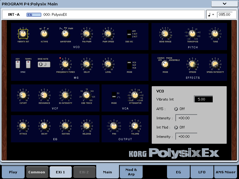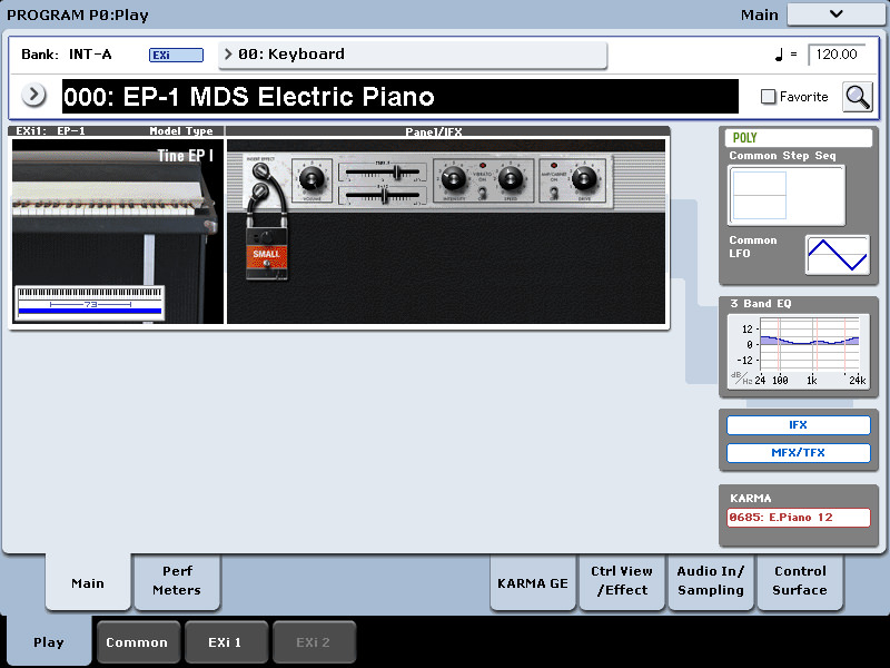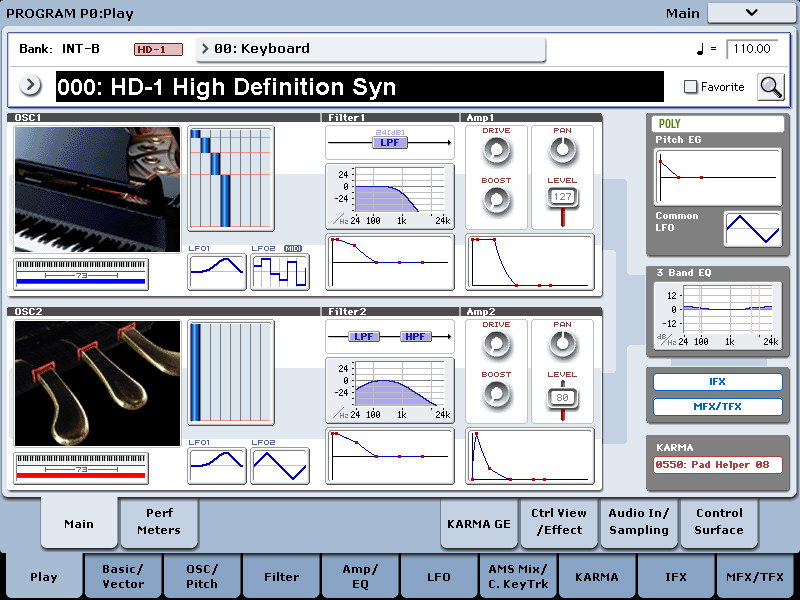 HD-1 High Definition Synthesizer: This is a significant PCM sound engine with vector synthesis that Korg claims is the most sophisticated of any keyboard they have built to date. Its PCM ROM contains over 1,500 multi-samples from several EXs libraries. The familiar, Single/Double/Drums/Double Drums-oscillator structure provides eight-way velocity switching and cross-fading, two-way layering per oscillator, split, Poly/Mono/Unison, Chord Memory, EQ, IFX, MFX, TFX and vector synthesis (which is also available for EXi programs).