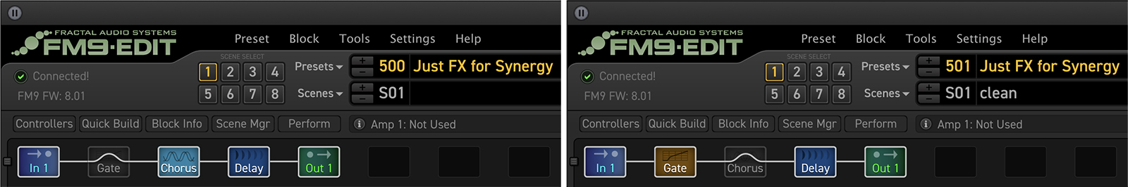 For direct access, the SYN-2 responds to both MIDI PC messages as well as CC messages, so we could assign some buttons on our foot controller to directly select amp channels while other buttons selected various presets that we saved.