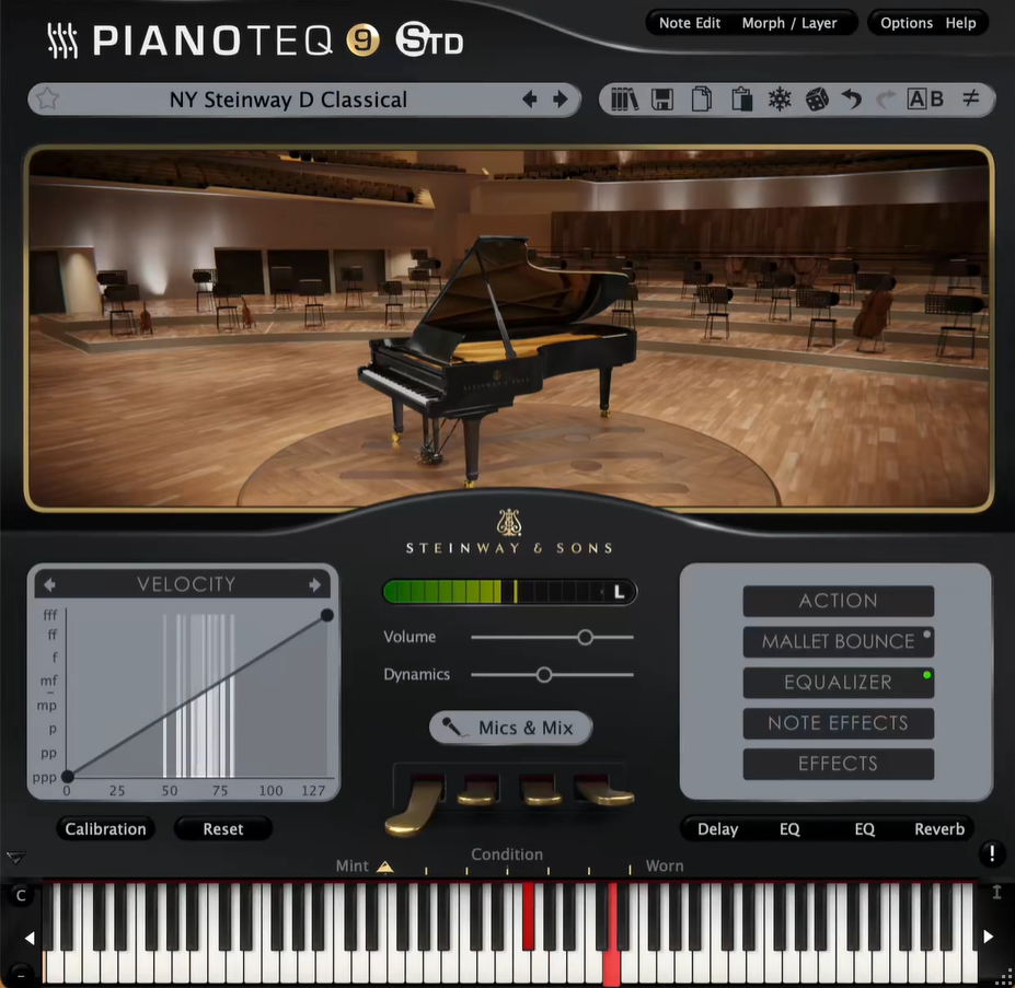 PIANOTEQ 9 introduces a new audio engine based on an improved model of the soundboard vibration, enhancing stereo and spatial perception. Each note you play creates a rich, vibrant swirl, making the sound feel organic and evolving, like ripples shimmering at the surface of a lake. Every grand piano in the collection benefits from this update and has been meticulously revoiced, bringing you the authentic experience of playing a world-class concert grand.