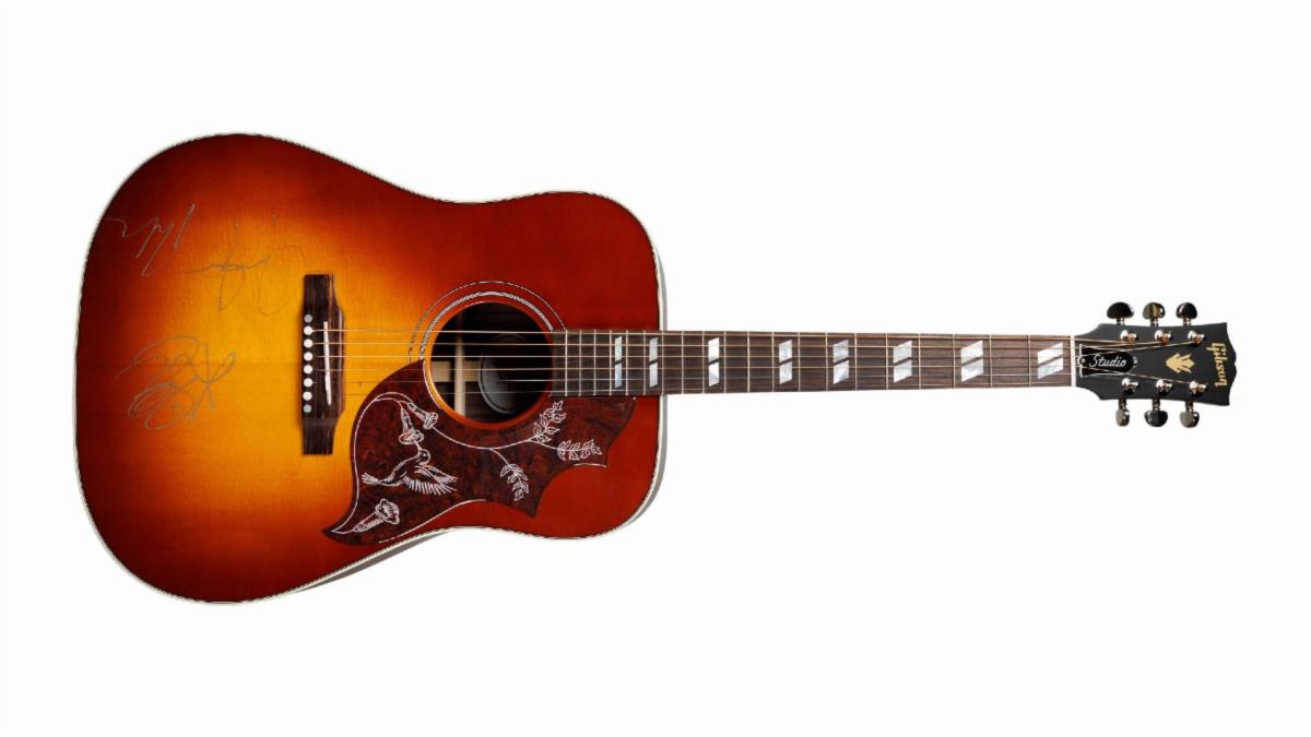 Gibson and Julien’s are thrilled to present a striking Gibson Hummingbird Standard acoustic guitar in Triburst, personally hand-signed by The Lumineers.