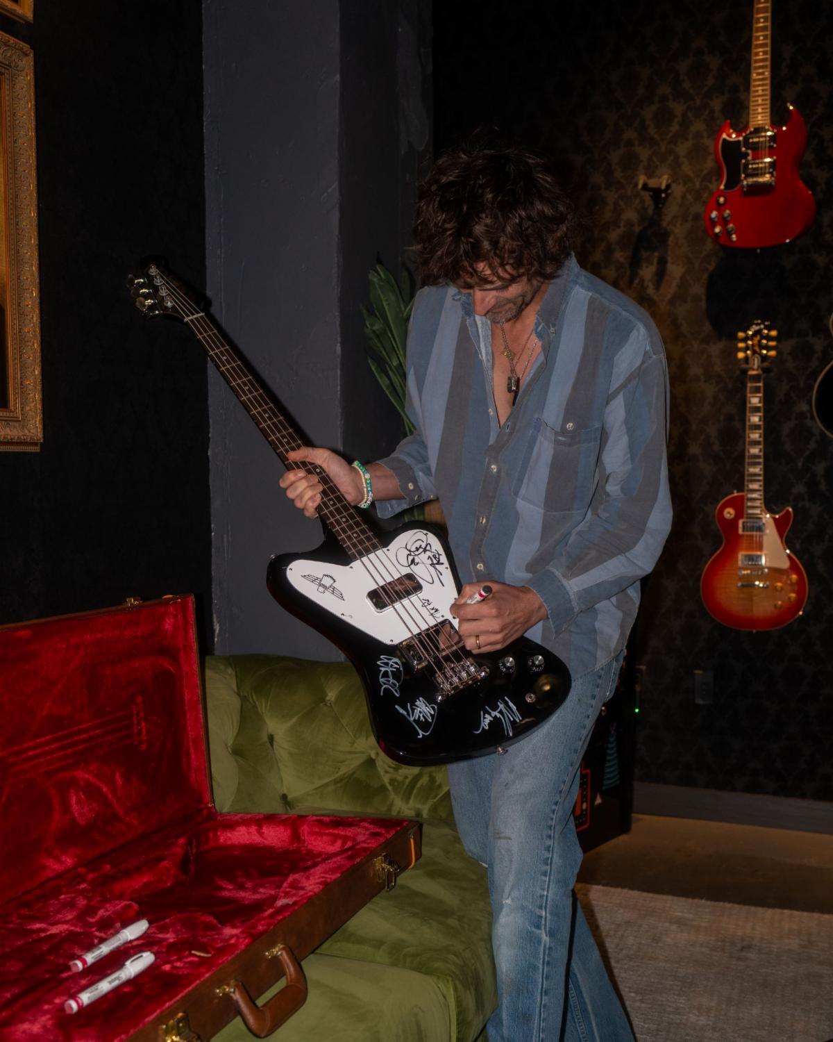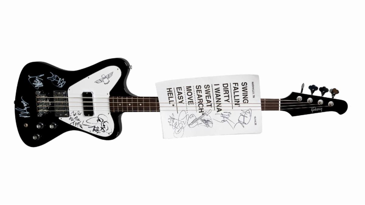 Gibson and Julien’s are thrilled to present an exceptional Gibson Non-Reverse Thunderbird Bass in Ebony, hand-signed by The All-American Rejects. This package also features a hand-signed set list from The All-American Rejects show on October 14, 2025 at Bridgestone Arena in Nashville.