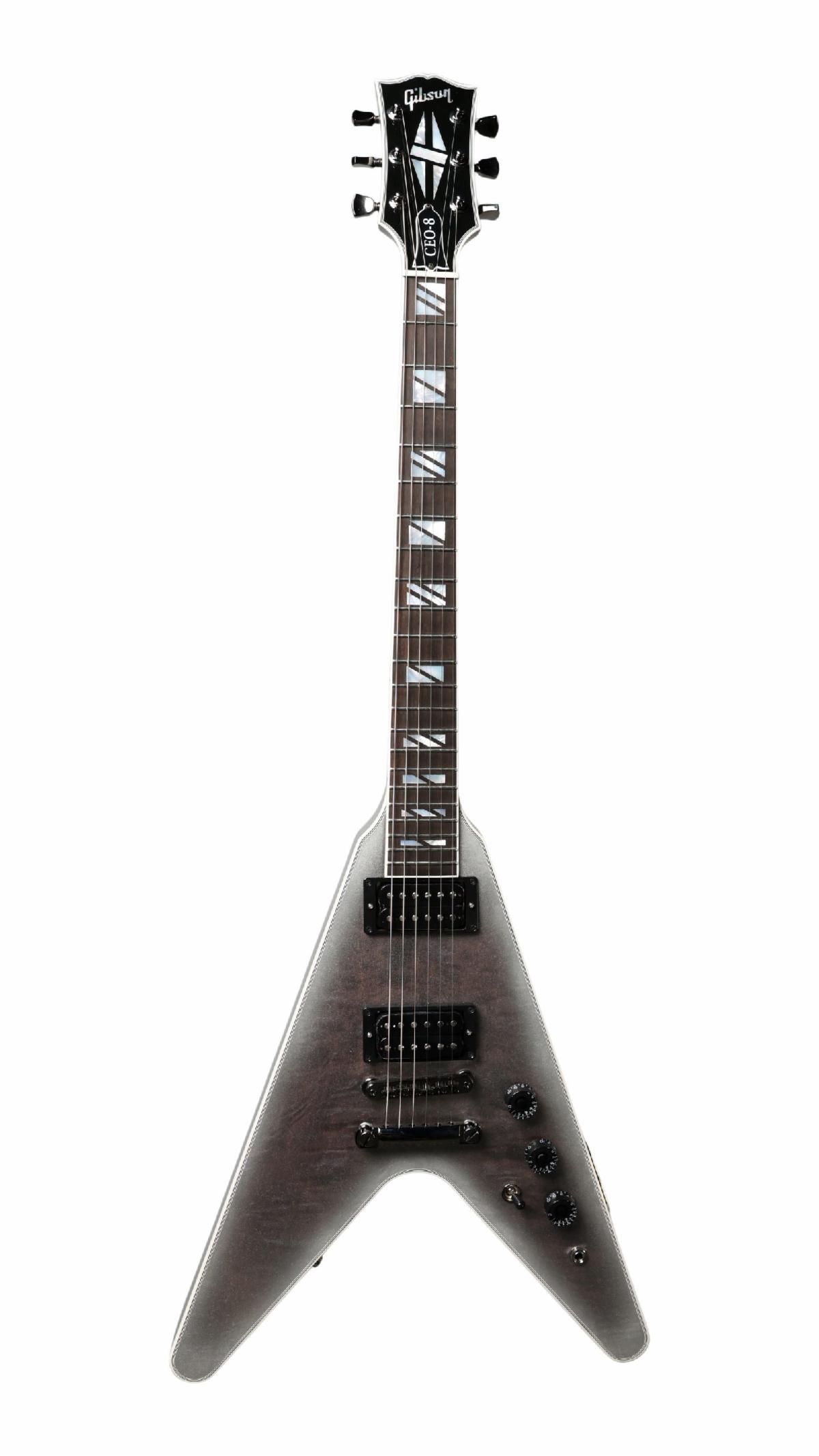 The Gibson Flying V CEO#8 is signed by Cesar Gueikian on the inside of the control cavity plate (along with a few other easter eggs inside the guitar). The CEO#8 features a 24.75-inch scale length mahogany neck, a bound 22 fret ebony fretboard with Supreme style split block mother-of-pearl inlays, a bound open book Gibson headstock with Custom model inlays, a truss rod cover engraved “CEO-8,” and a pair of uncovered pickups. Its mahogany body with a multi-ply bound quilted maple top is finished in Ghost Burst—the finish name was coined by Adam Jones, guitarist of Tool. The guitar arrives with a hardshell guitar case.