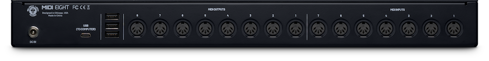 The MIDI Eight is fully class-compliant for plug-and-play use with macOS and Windows — no drivers or installers required. It is equally comfortable as a studio interface or as the nerve center of a touring rig. Power it via USB when connected to a computer, or switch to the included DC adapter to run the unit completely standalone.