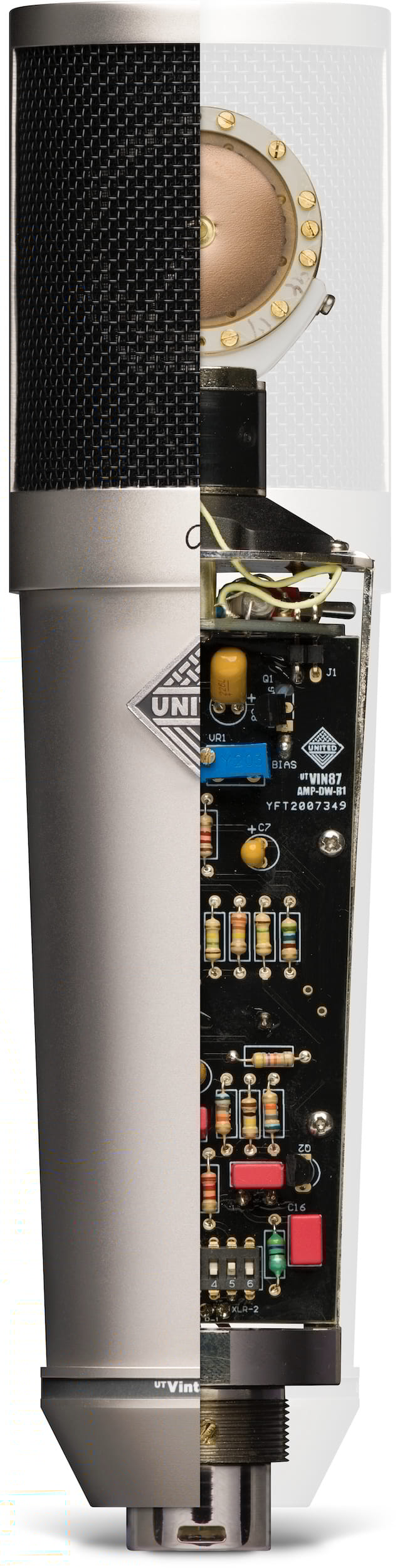 Supporting the capsule is a large-core, custom-wound, US-made output transformer developed exclusively by United. Inspired by early German transformer designs, but rebuilt without any of the size or mass limitations, the UT transformer uses all-nickel laminations and nearly four times the metal mass of typical ’87-style mic transformers. The result is unmatched headroom, an open and three- dimensional sound, and a low-frequency response that remains fully intact on even the longest cable runs.