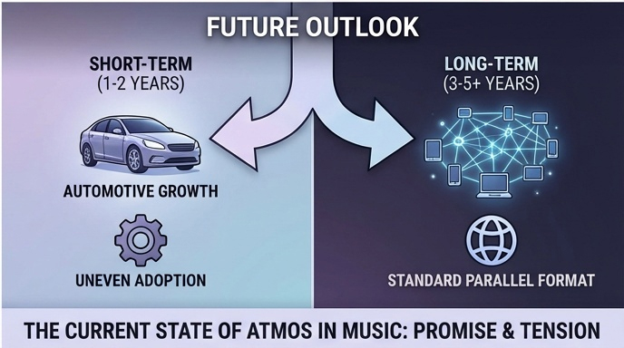 Over a longer horizon, Atmos is positioned to become a standard parallel master format for mainstream releases, coexisting with stereo rather than replacing it. Continued automotive adoption and simplified consumer hardware are likely to strengthen immersive audio’s everyday relevance.
