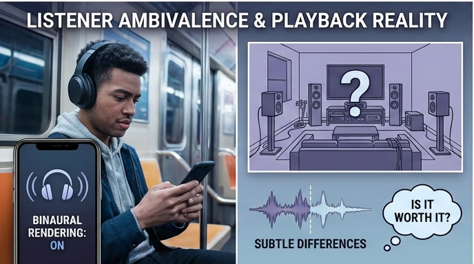 Headphone-based binaural rendering can approximate spatial effects, but results vary widely depending on device, platform, and mix quality. Many listeners encounter differences that are subtle or inconsistent—insufficient to justify a shift in listening habits. Home theater systems capable of full Atmos playback remain a minority installation, and even when compatible hardware is available, configuration complexity can discourage everyday use.