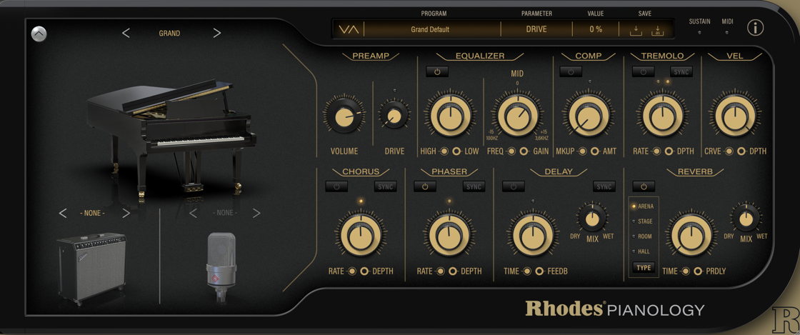 Pianology includes a streamlined set of sound-shaping controls designed to support expressive performance and practical production workflows. Global controls include Timbre Shift, Global Tune, Mechanical Noise, and Lid Position for the grand piano, allowing adjustment of tonal balance, tuning reference, and acoustic behavior.An integrated Amp and Mic section provides access to amplifier models and microphone choices derived from Rhodes V8 Pro, supporting both natural acoustic presentations and more processed, amplified tones. Additional processing includes piano-voiced compression, EQ, modulation, delay, stereo tremolo, panning, and a selection of Rhodes reverbs, including the new Stage and Arena reverb modes. The tremolo effect is based on the Vintage Grand's circuitry, bringing that character to Pianology.Velocity curve and velocity depth controls allow the playing response to be adapted to different controllers and performance styles, with presets capturing the complete state of the instrument for consistent recall across sessions.
