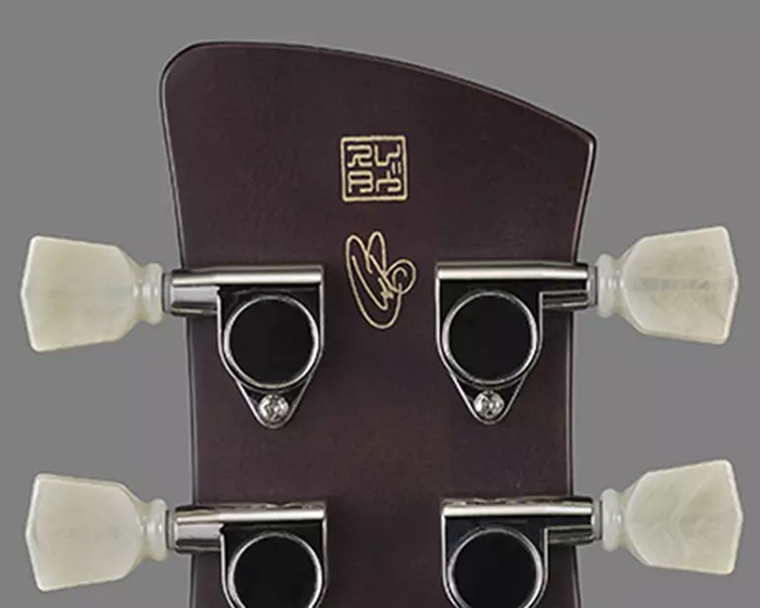 The pearloid, waffle, die‑cast tuners feel smooth and classy, whether they’re 15:1 or 18:1. The back of the neck and headstock have a satin finish that makes everything feel fast and effortless, while the double‑cut body and headstock face are done in a gloss poly. The back of the guitar is a deep, rich, reddish‑brown that perfectly complements the warm gold top.